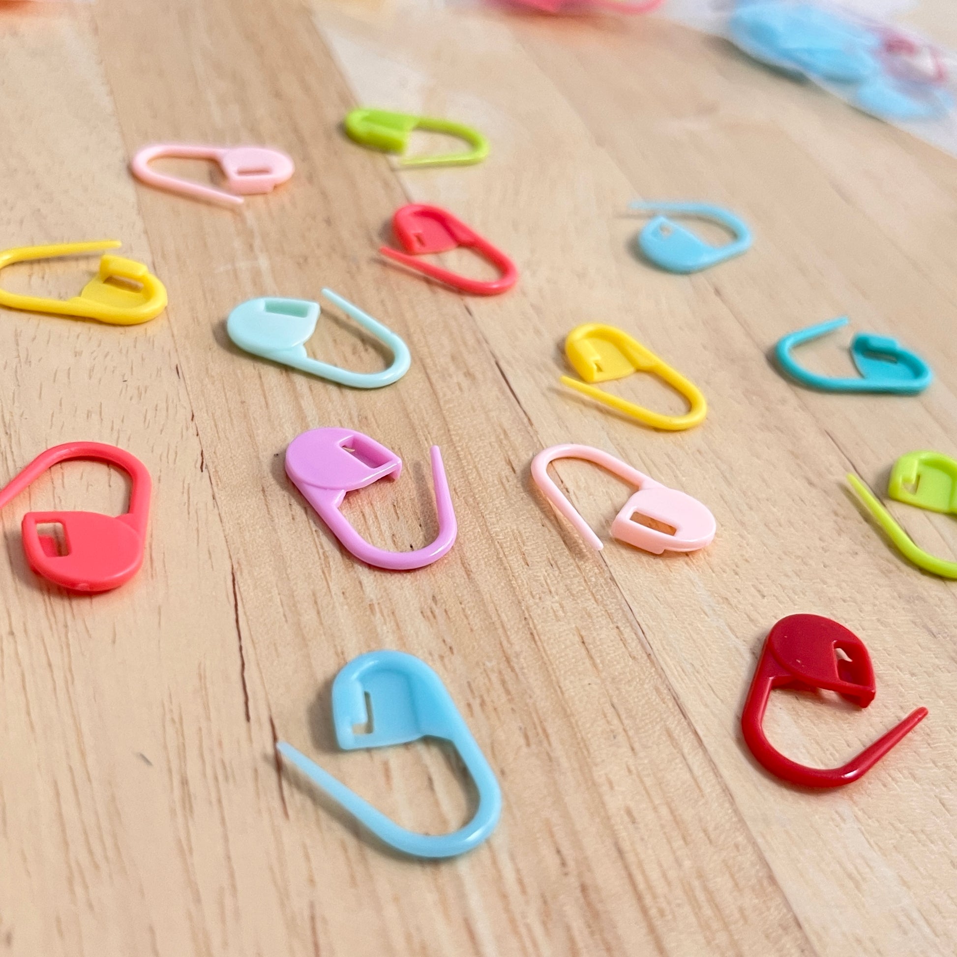 Keep track of your stitches and rows with these colorful, plastic stitch markers! Each bag contains nine makers in one color and a tenth marker of a different color. Please note that if shopping online, the color of the tenth stitch marker is randomized; our color listing refers only to the primary color used in each bag.