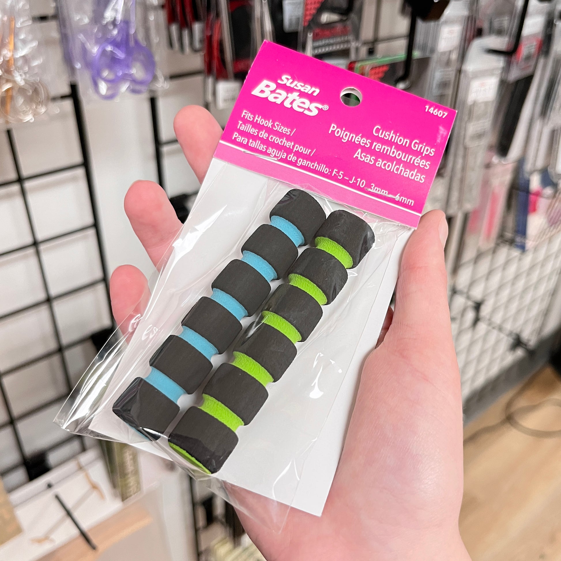 Helping to alleviate hand strain, Susan Bates Cushion Grips contain two brightly colored, sponge grips which fit crochet hooks F to J.