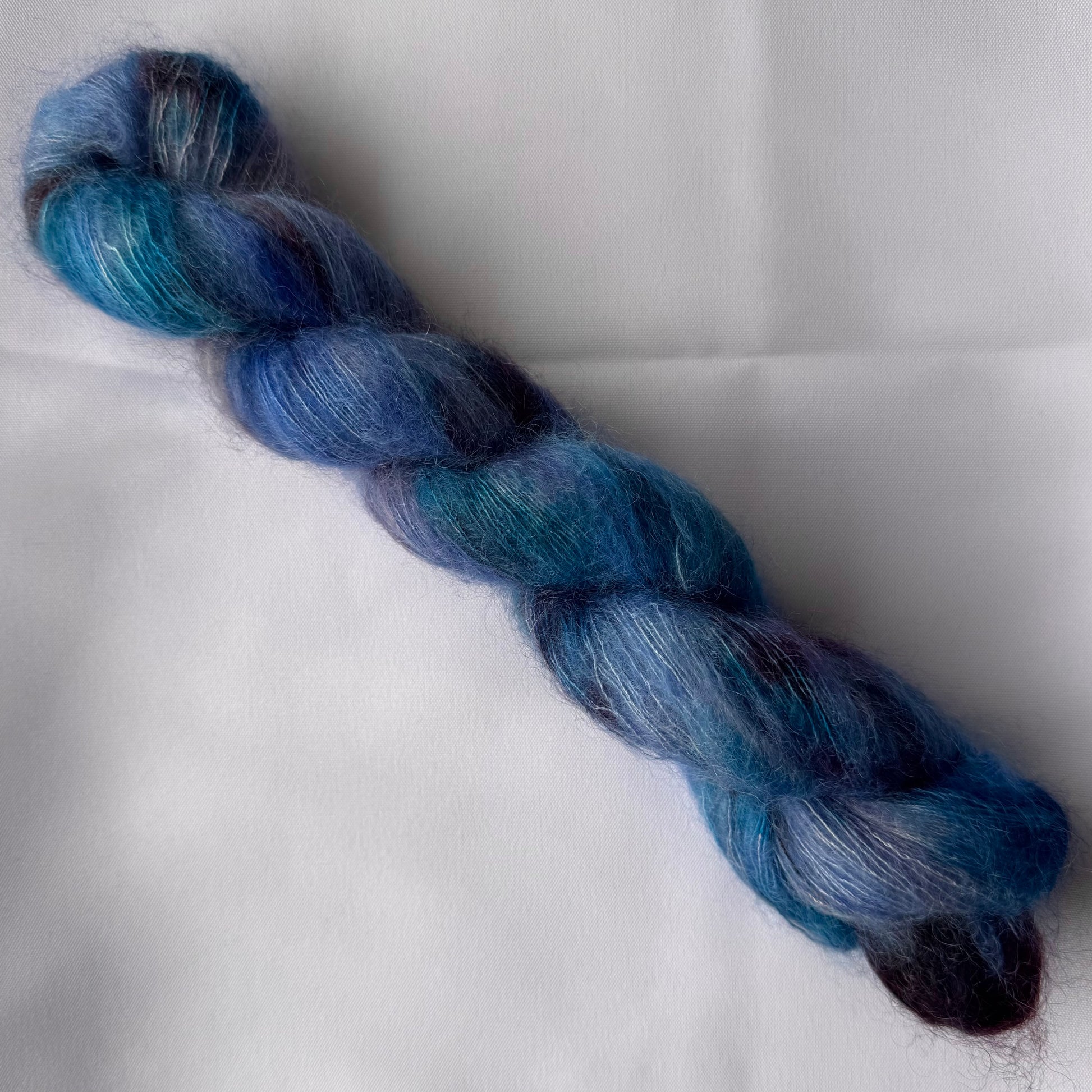 Fluff is a brushed mohair yarn sold in 50 gram skeins. This hand dyed delight would make a beautiful light weight fluffy and airy fabric on its own or would be stunning held double with another yarn to add a magical halo to your fabric.